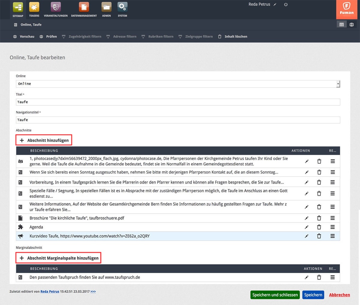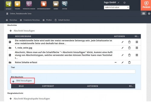 Die redaktionelle Seite wird wohl der meist verwendete Seitentyp sein. Jede Inhaltsseite ist eine redaktionelle Seite und deshalb hat diese auch sehr viele Möglichkeiten. Das "Herzstück" hierbei sind die Abschnitte. Nachfolgend, gehen wir genauer auf die Abschnitte und die Marginalabschnitte ein.