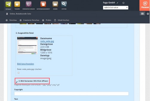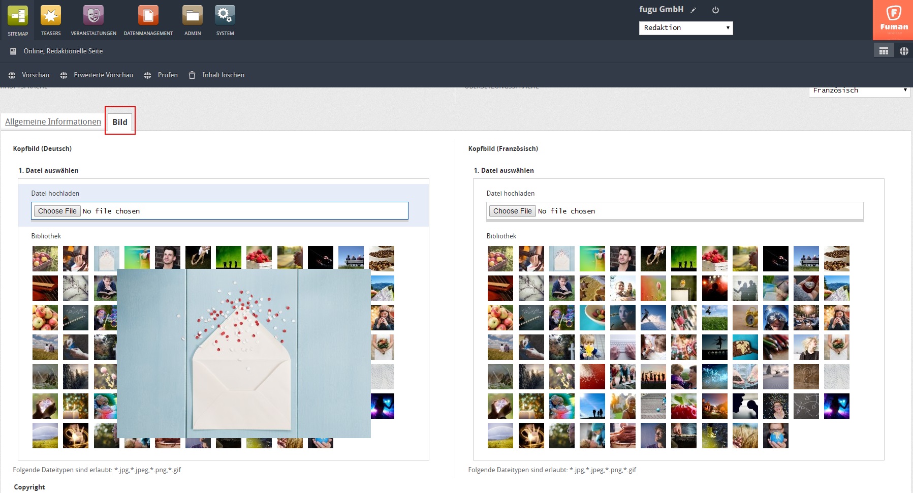 Falls man auf der redaktionellen Seiten ein Kopfbild haben möchte, muss man das Register wechseln (auf "Bild").