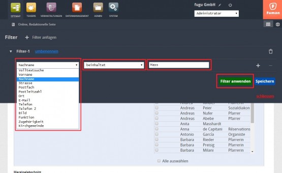 Hier kann man eine Kontaktperson auswählen, welche danach ausgegeben wird. Die Kontaktperson kann man gleich filtern wie der Standort (siehe Galerie oben).
