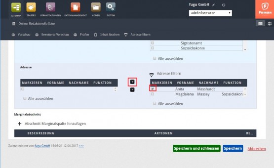 Die Kontaktpersonen, kann man wie die Agenda, konfigurieren. Man kann Personen nach derer Zugehörigkeit hinzufügen und zusätzliche einzelne Kontaktpersonen hinzufügen. Die entsprechenden Tabellen kann man filtern.