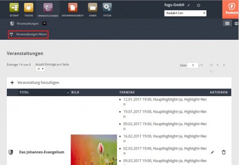 Bei den Veranstaltungen werden alle eigenen Veranstaltungen aufgelistet. Um einzelne Veranstaltungen besser finden zu können, kann man wie gewohnt im Fuman filtern.