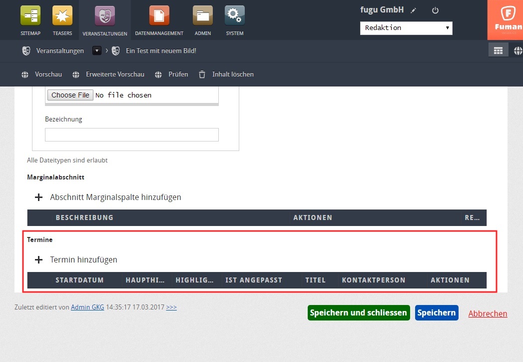 Sobald man nun auf "Speichern" klickt, wird die Veranstaltung angelegt und man kann Termine der Veranstaltung hinzufügen.