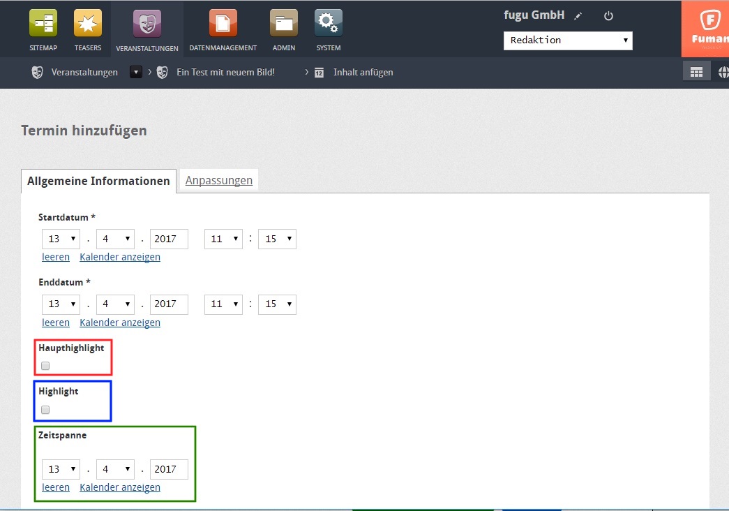Wenn man nun eine neue Veranstaltung hinzufügt erscheinen eine ganze menge Felder, welche alle selbsterklärend sind.