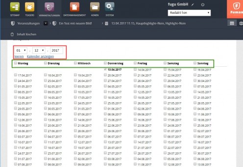 Die Zeitspanne dient dazu wiederkehrende Termine von einer Veranstaltung einfach zu erfassen. Falls man z.B. eine Veranstaltung bis ende Jahr, jeden Dienstag stattfinden lassen möchte, kann man die Zeitspanne auf ende Jahr setzten. Nun werden ganz viele Checkboxen mit allen Daten bis zu diesem Zeitpunkt generiert. Man kann nun die entsprechenden Termine auswählen/abwählen oder eine Wochentag wählen. Falls man einen Wochentag auswählt, werden alle entsprechenden Daten selektiert.