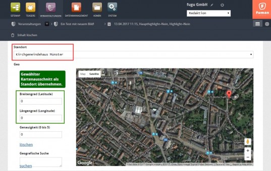 Achtung: Standardmässig zeigt der Pointer der Google-Maps Karte auf die fugu GmbH, da die Google-Karte einen Standard-Pointer benötigt. Solange die Felder von Länge- und Breitengrade 0 anzeigen, wird der Standort der Veranstaltung genommen (oder des Termins).