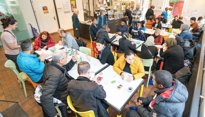 Geflüchtete Menschen, Quartierbewohnende und weitere Interessierte sitzen zusammen und tauschen sich bei Kaffee, Tee und einem Zvieri aus.
